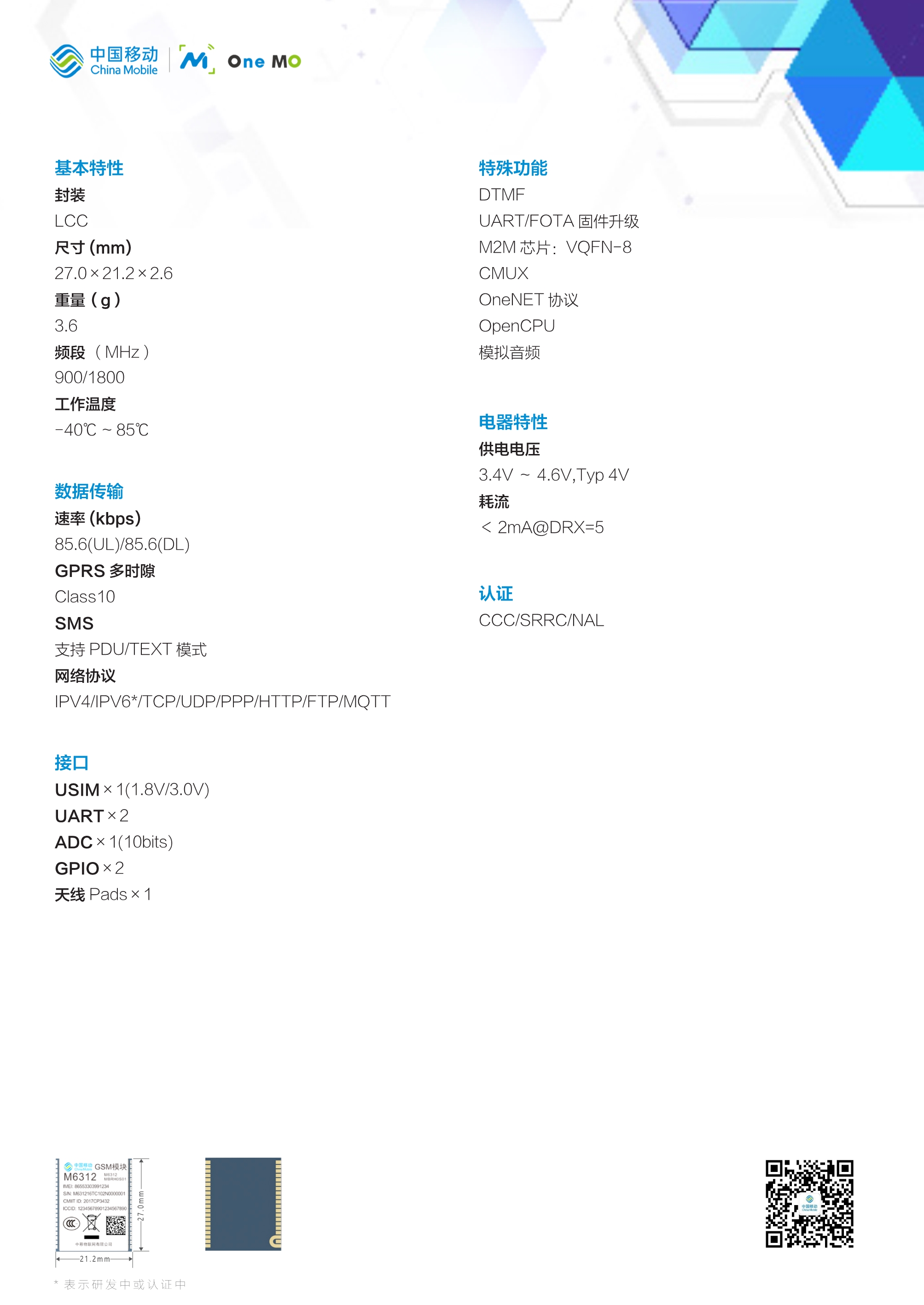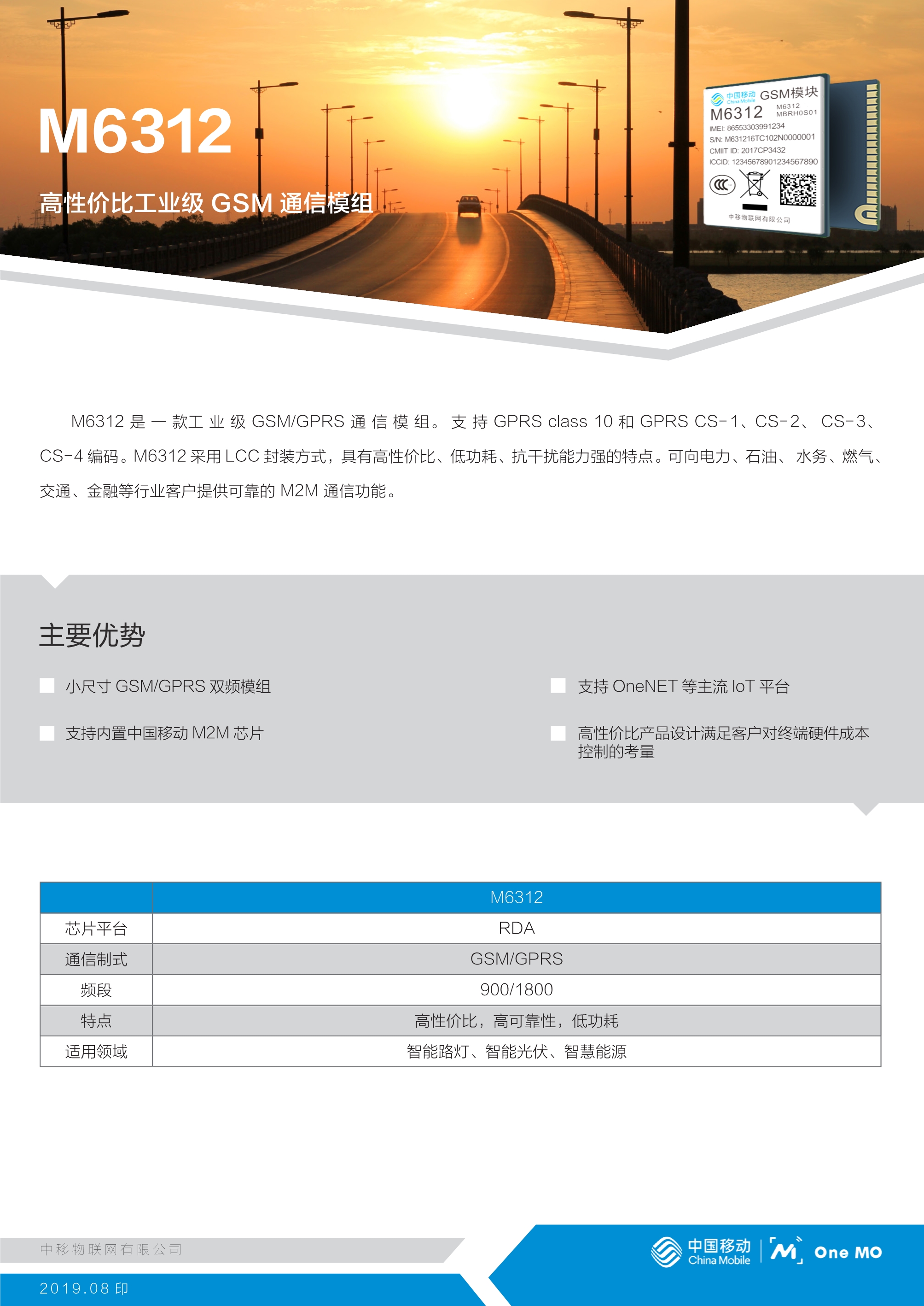M6312 是一款GSM/GPRS 2G 工業級通信模組。支持GPRS class 10 和GPRS CS-1、CS-2、CS-3、CS-4 編碼。M6312 采用LCC 封裝方式,具有高性價比、低功耗、抗干擾能力強的特點。可向電力、石油、水務、燃氣、交通、金融等行業客戶提供可靠的M2M 通信功能。
