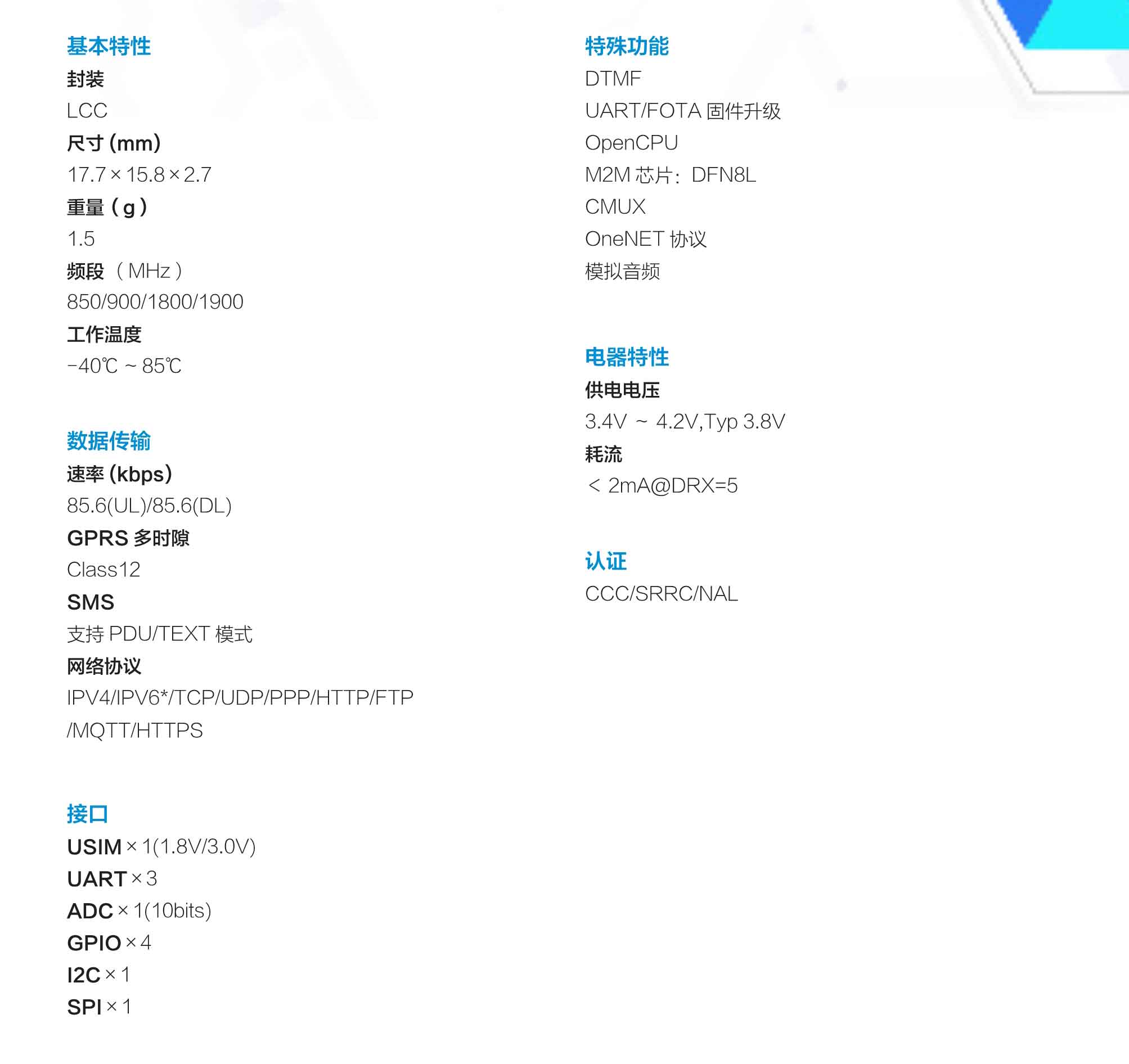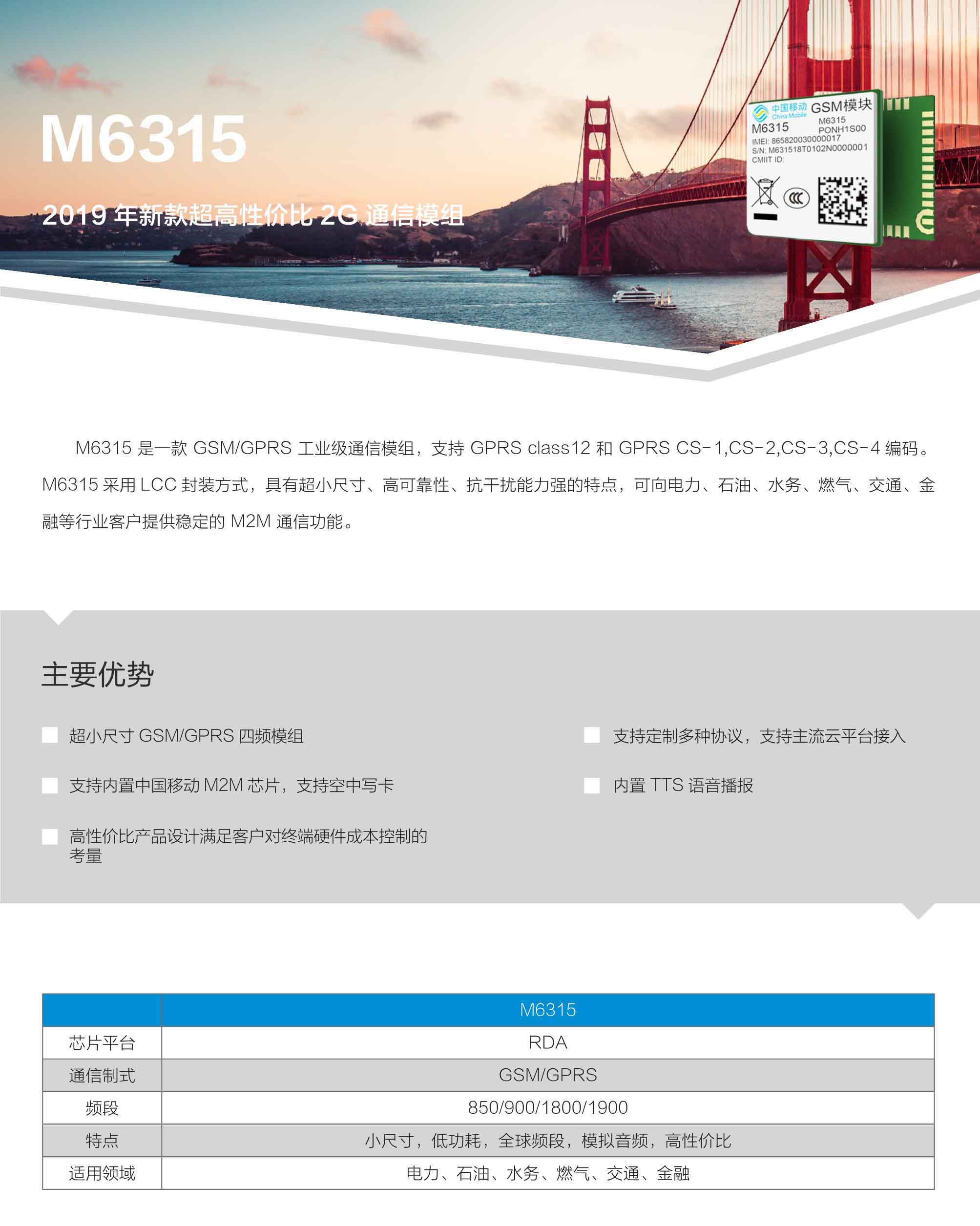 M6315 是一款GSM/GPRS 工業級通信模組,支持GPRS class12 和GPRS CS-1,CS-2,CS-3,CS-4編碼。M6315 采用LCC 封裝方式,具有超小尺寸、高可靠性、抗干擾能力強的特點,可向電力、石油、水務、燃氣、交通、金融等行業客戶提供穩定的M2M 通信功能。