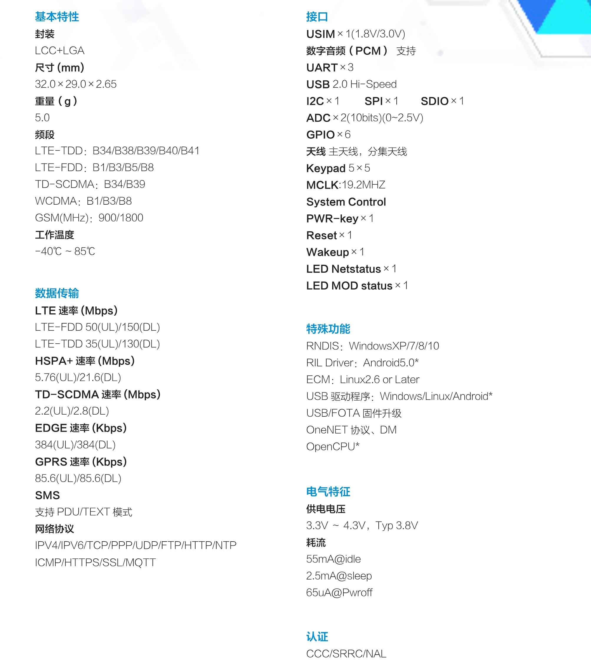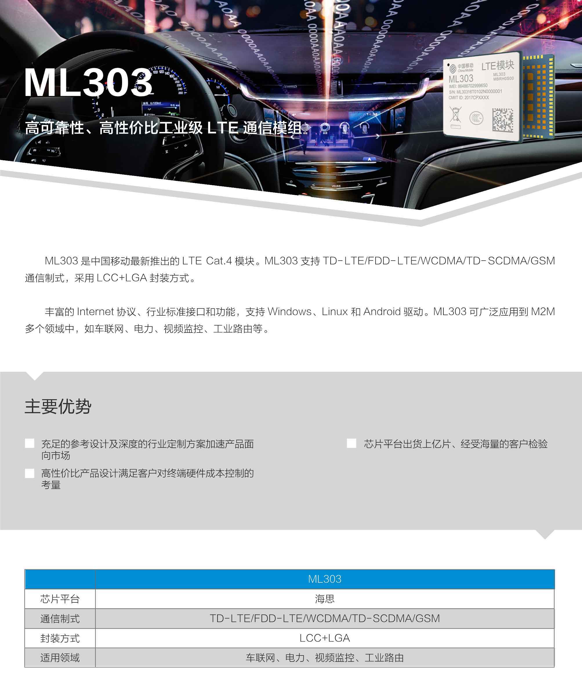 ML303 是中國移動最新推出的 LTE Cat.4 模塊。ML303 支持 TD- LTE/FDD- LTE/WCDMA/TD- SCDMA/GSM通信制式,采用 LCC+LGA 封裝方式。 豐富的 Internet 協議、行業標準接口和功能,支持 Windows、Linux 和 Android 驅動。ML303 可廣泛應用到 M2M多個領域中,如車聯網、電力、視頻監控、工業路由等。