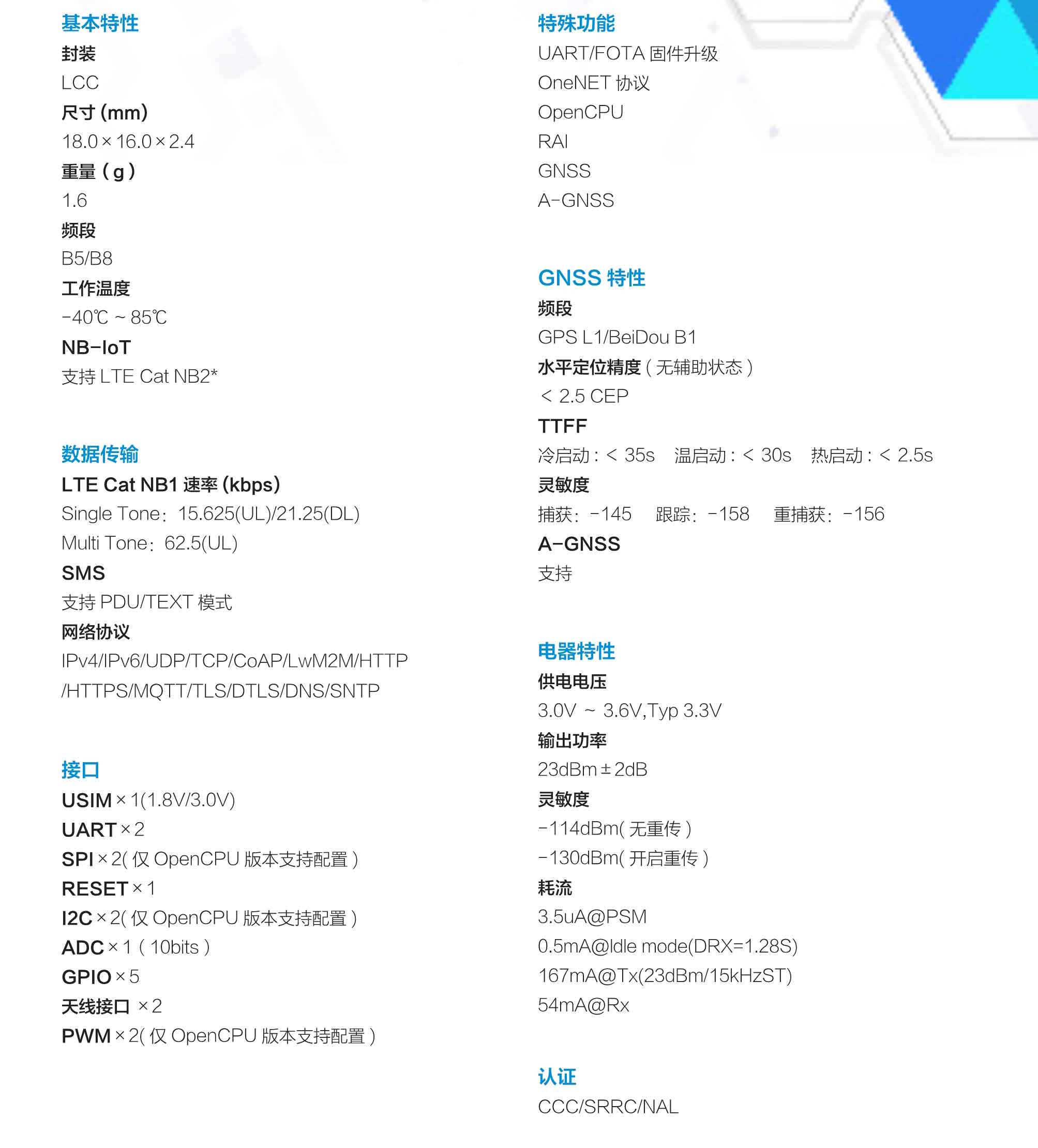 N10SG 是 一 款 高 性 能、 低 功 耗 的 NB/GNSS 無 線 通 信 模 組, 采 用 LCC 封 裝, 尺 寸 僅 為18.0mmx16.0mmx2.4mm,滿足《中國移動蜂窩物聯網通用模組技術規范》。 N10SG 在引腳設計上兼容中移物聯 M5311 系列模組,為有定位需求的 NB-IoT 客戶提供產品設計、升級的便利。N10SG 提供豐富的外設接口,滿足客戶各種應用開發的需