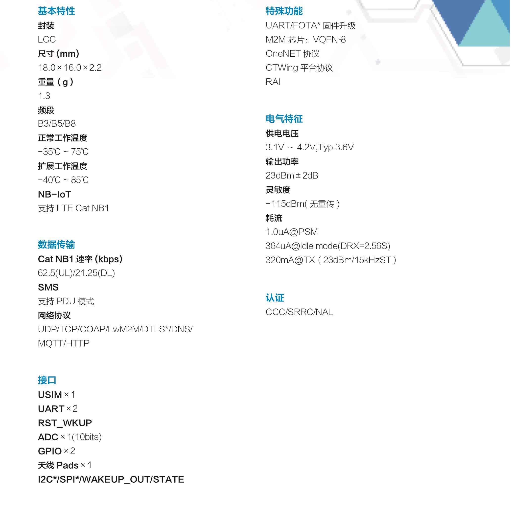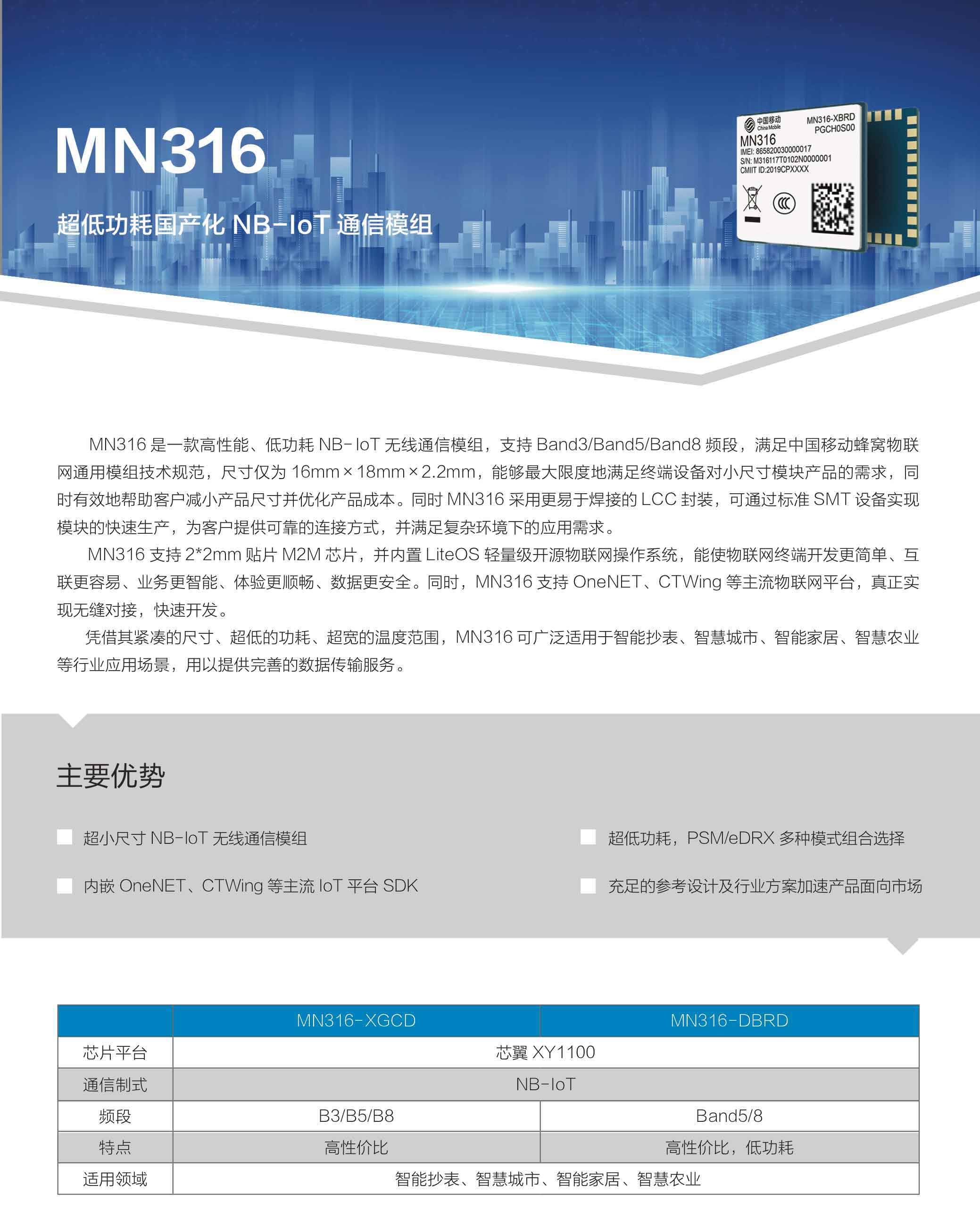 MN316 是一款高性能、低功耗 NB- IoT 無線通信模組,支持 Band3/Band5/Band8 頻段,滿足中國移動蜂窩物聯網通用模組技術規范,尺寸僅為 16mm×18mm×2.2mm,能夠最大限度地滿足終端設備對小尺寸模塊產品的需求,同時有效地幫助客戶減小產品尺寸并優化產品成本。同時 MN316 采用更易于焊接的 LCC 封裝,可通過標準 SMT 設備實現模塊的快速生產,為客戶提供可靠的